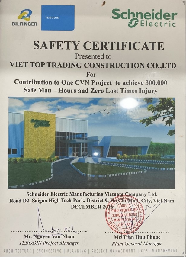 Safety First is one of Viettop's the three principles of operation, maintaining a safe working environment, preventing labor accidents. On-site engineers and workers have been trained for safety code frequently, providing labor protective equipment and having accident insurance for every project.